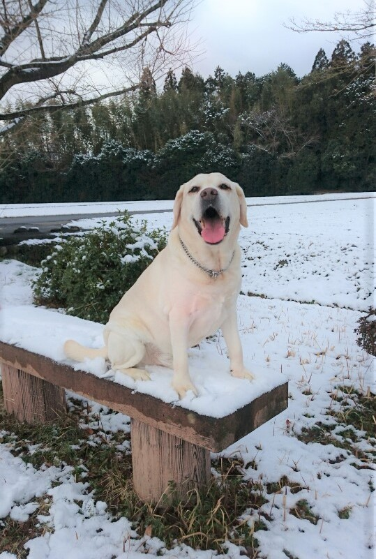 久しぶりに雪が積もったからパパと一緒に近くの公園で雪遊びをしました、疲れたのでベンチの上で一休みでーす