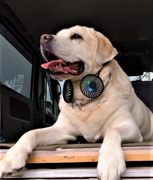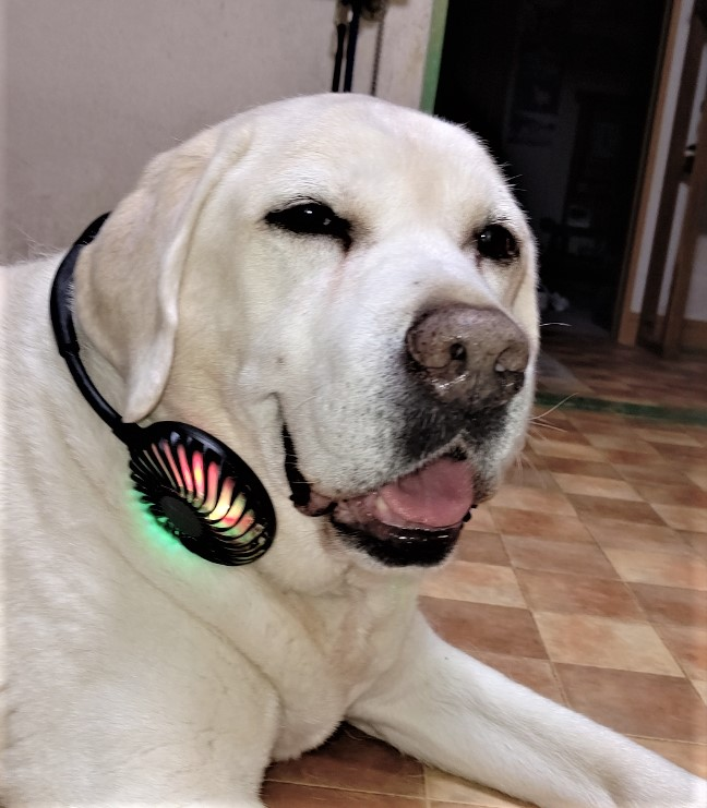 ホームセンターに有った人間用の首掛けファンをラブちゃんに付けてみました所すこぶる好評?(全く嫌がりません)でした。