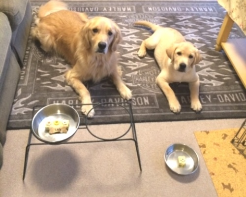 お兄ちゃんの真似をして上手に伏せ、待てができました。