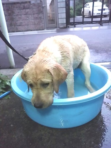 朝晩2回のシャワーをしているおかげか、金髪ヘアが生えております。昨日、夕方の散歩から帰宅後、自宅前に水入りのタライを出すと…大はしゃぎのめい。全自動洗濯機のように、右回り・左回りを十数回繰り返し、こちらが目が回りました。