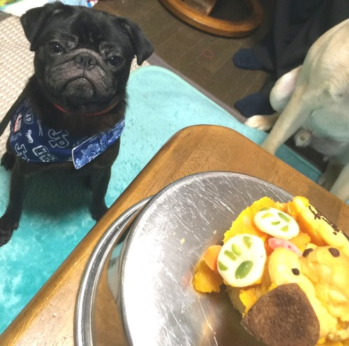 先日、ベンジャミン(6月22日生まれ)の1歳とフランク(7月23日生まれ)の2歳の誕生日を祝い合同の誕生会をしました。ペット用のケーキを用意し、ベンジャミンの前に置くとなんとか待てはできましたが、早く食べたくて鼻を近づけたり、舌を出してちょっと舐めたりしていました(リードで引っ張っていました)。