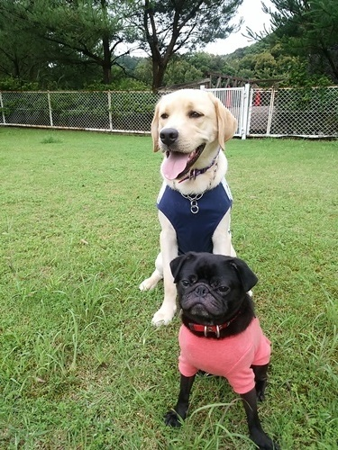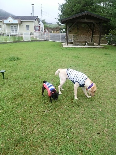 眠っている2匹に手を合わせた後、霊園にあるドッグランに行きましたが、2匹以外に犬はおらず他の犬たちと遊ぶことはできませんでした。2匹は最初は走っていましたが、突然2匹で草を食べ始めました。写真はその時のもので、白ヒツジと黒ヒツジの様でした。