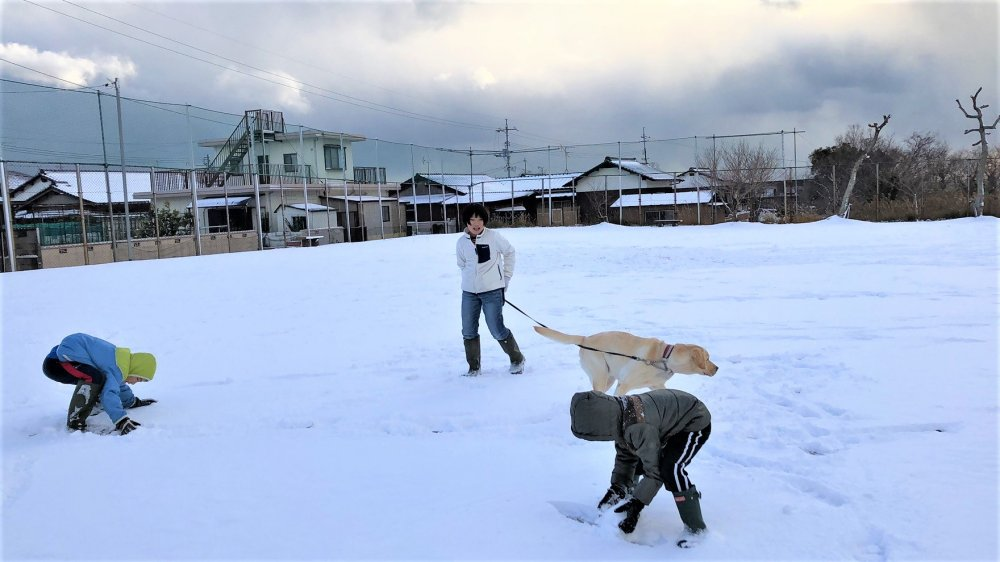 先日は、この辺りでは珍しいくらいたくさん積もったので、雪の中みんなで散歩へ出かけました。アルマスも子供たちと楽しそうに走っていました。