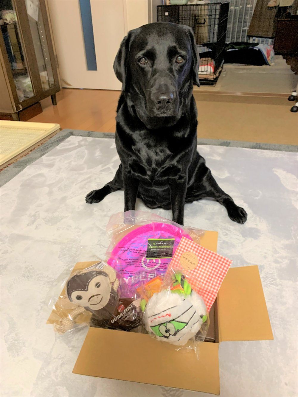 小包が届いて中を開けるとオモチャを見て興奮しています。