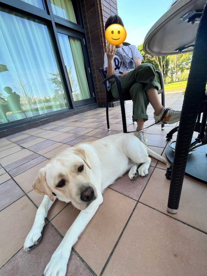 私たちがお茶や軽食を楽しんでいる間、ハルはいい子に足元でゆっくり寛ぎ、他のカフェ利用者さんを目で追ったり鳥や木の動きをじっと観察しています。本当にいい子です。