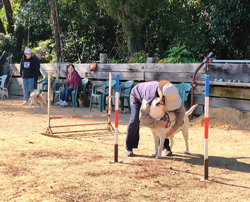 まだ1歳になったばかり、始めたばかりなので、飛び越えるバーは小型犬用、タイムは無視、一周回り終えたら ほめまくりです。