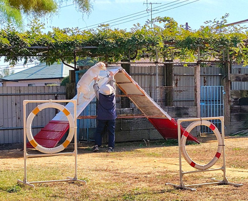 誰かと一緒なら外で遊びましょうか~、といった感じなのですが、アジリティを始めたところ けっこう楽しんでいるように見えます。(私の方が楽しんでいます)